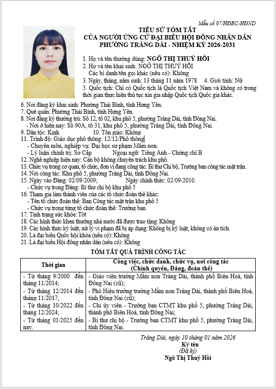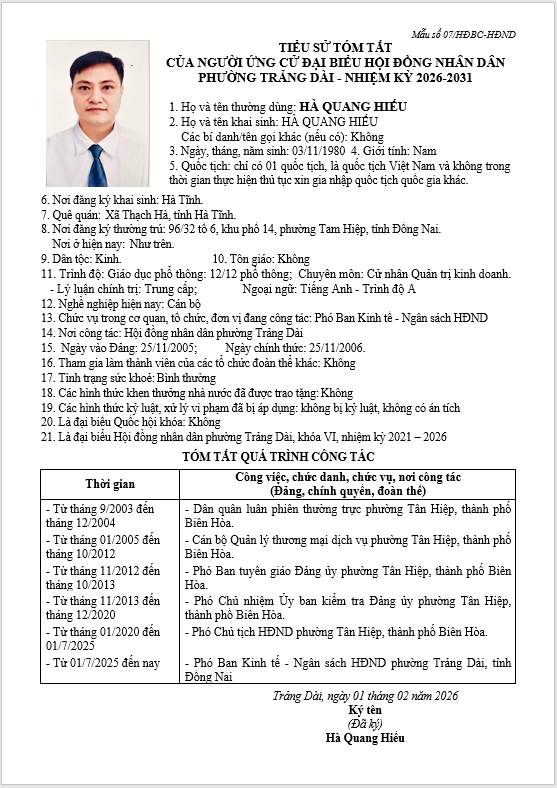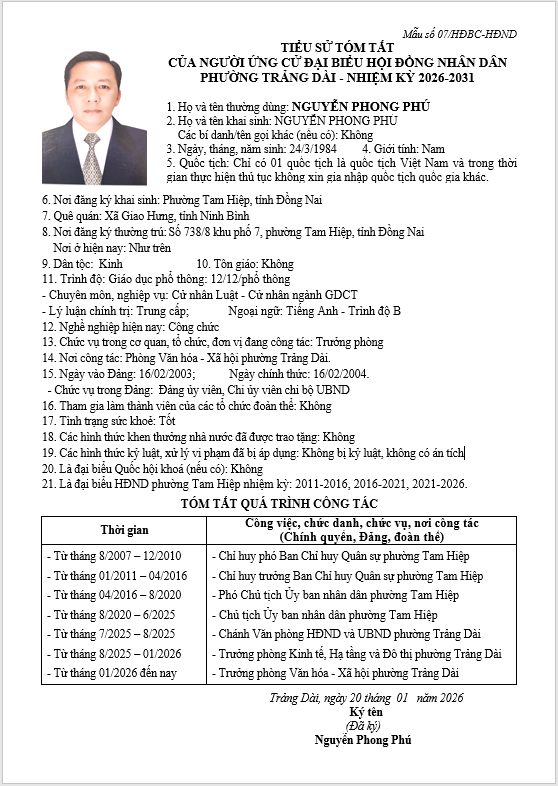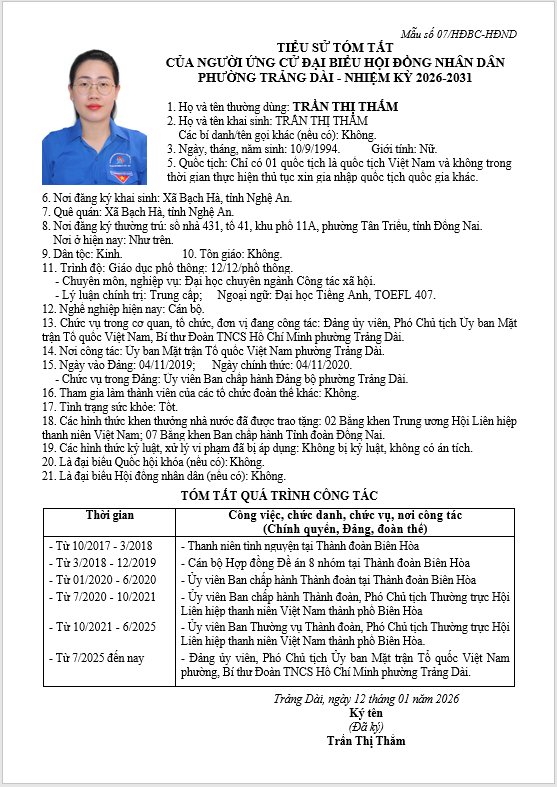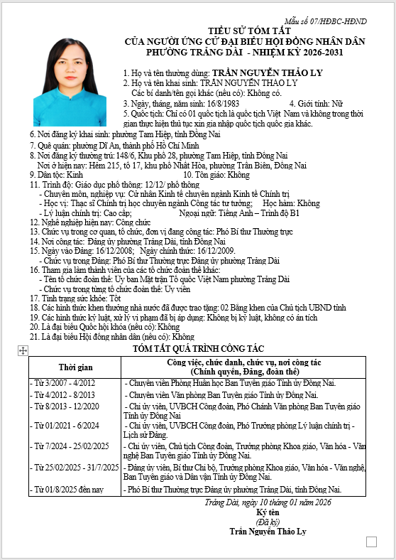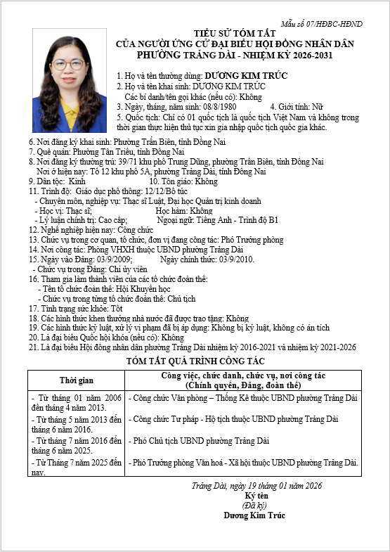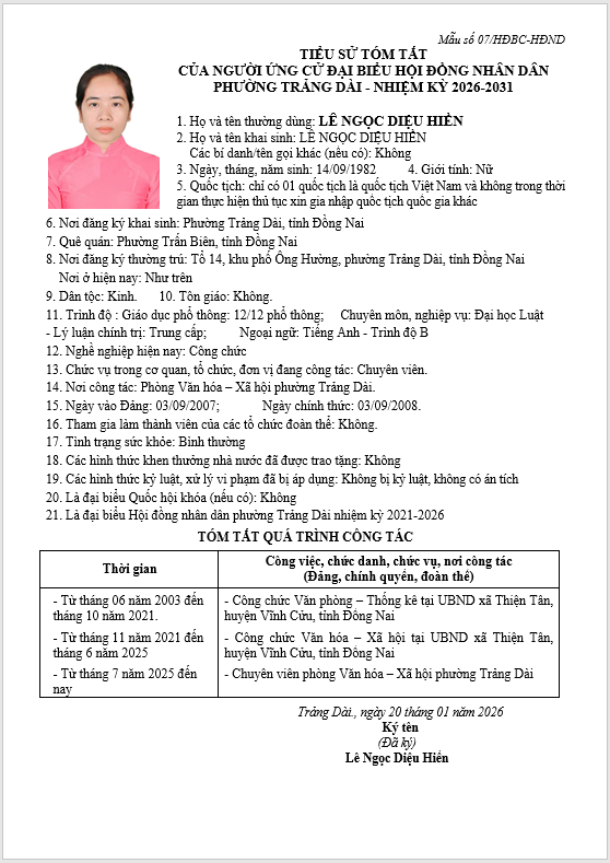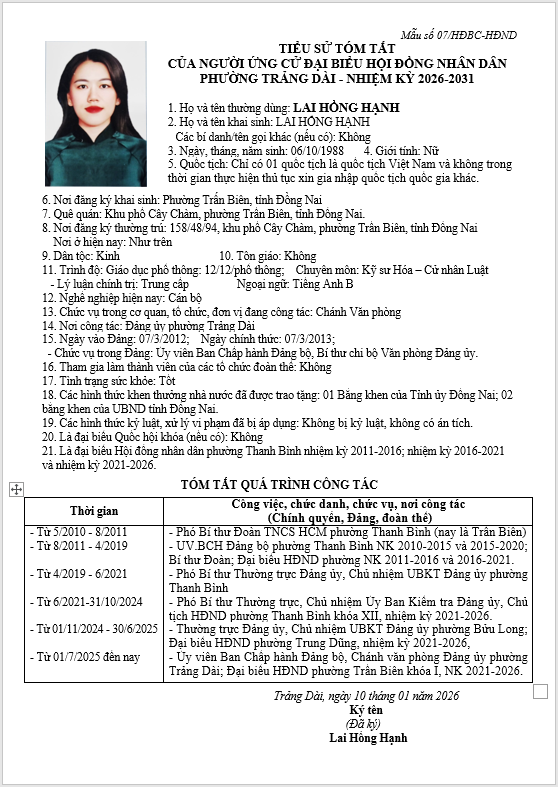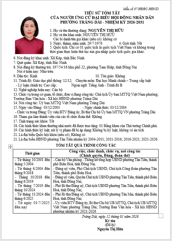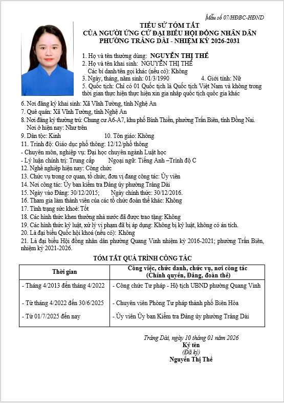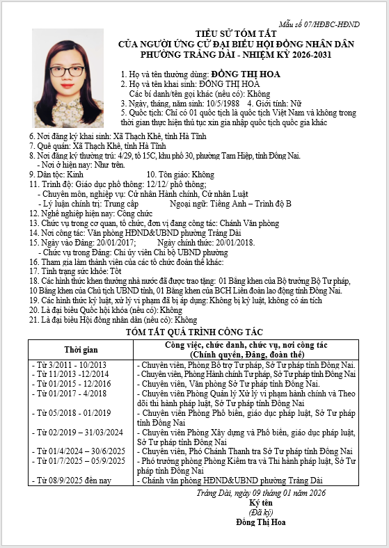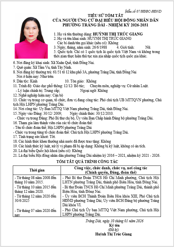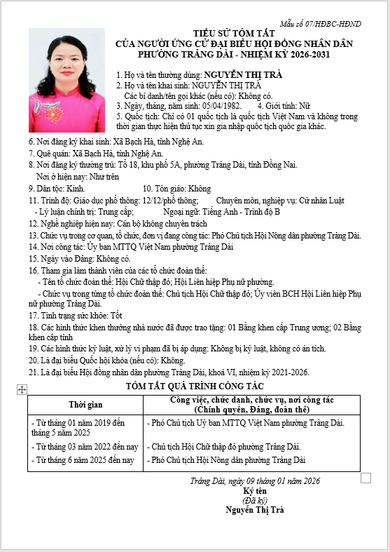 TIỂU SỬ TÓM TẮT CỦA NGƯỜI ỨNG CỬ ĐẠI BIỂU HỘI ĐỒNG NHÂN DÂN PHƯỜNG TRẢNG DÀI - NHIỆM KỲ 2026-2031