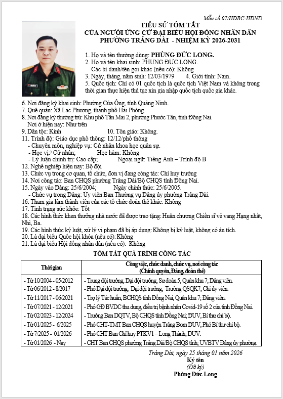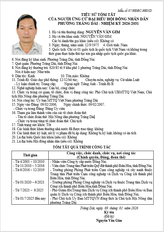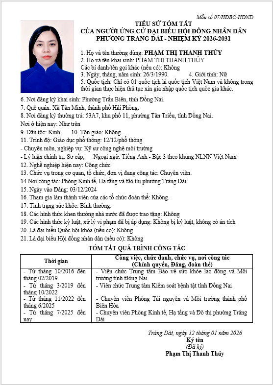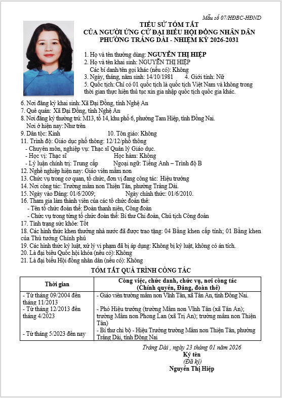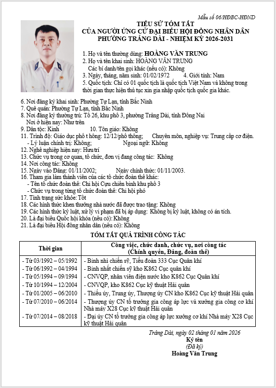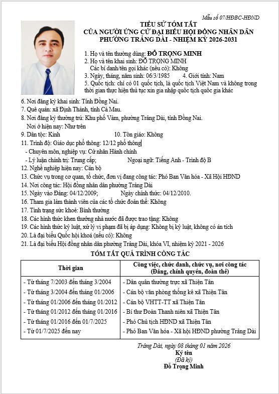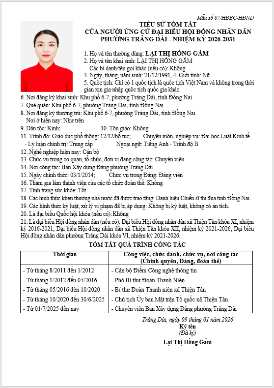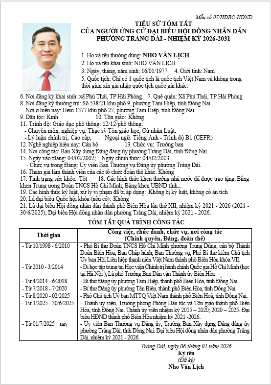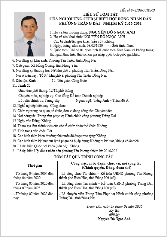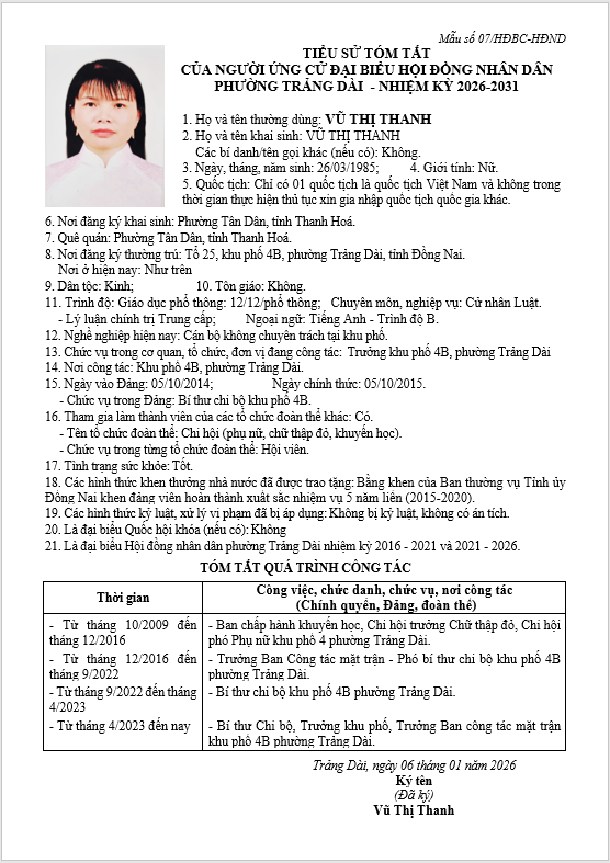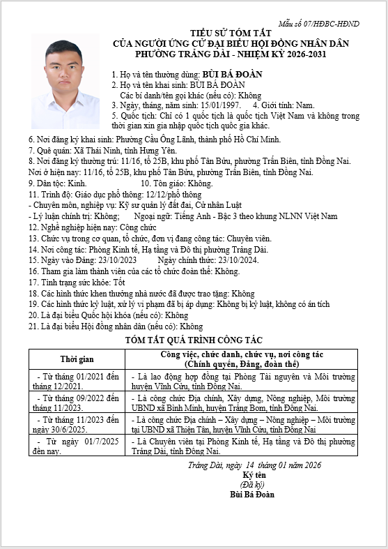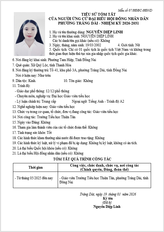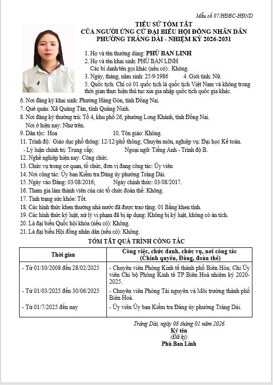 TIỂU SỬ TÓM TẮT CỦA NGƯỜI ỨNG CỬ ĐẠI BIỂU HỘI ĐỒNG NHÂN DÂN PHƯỜNG TRẢNG DÀI - NHIỆM KỲ 2026-2031