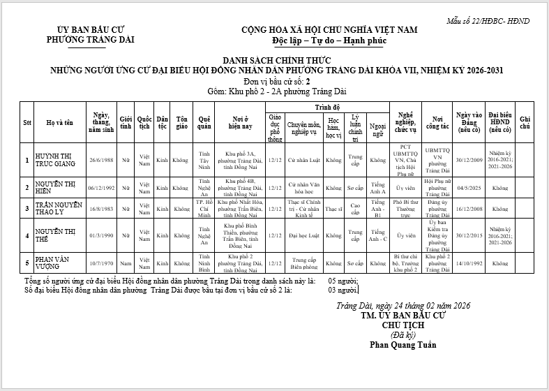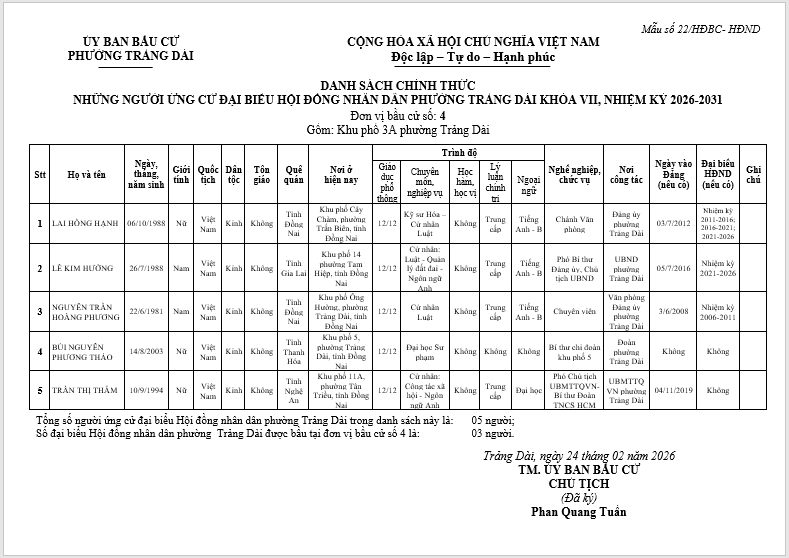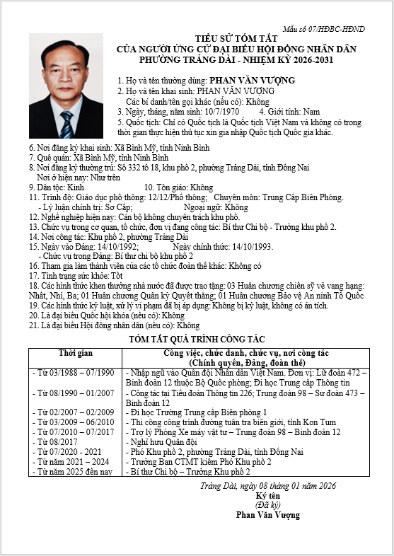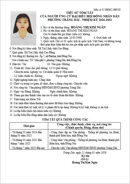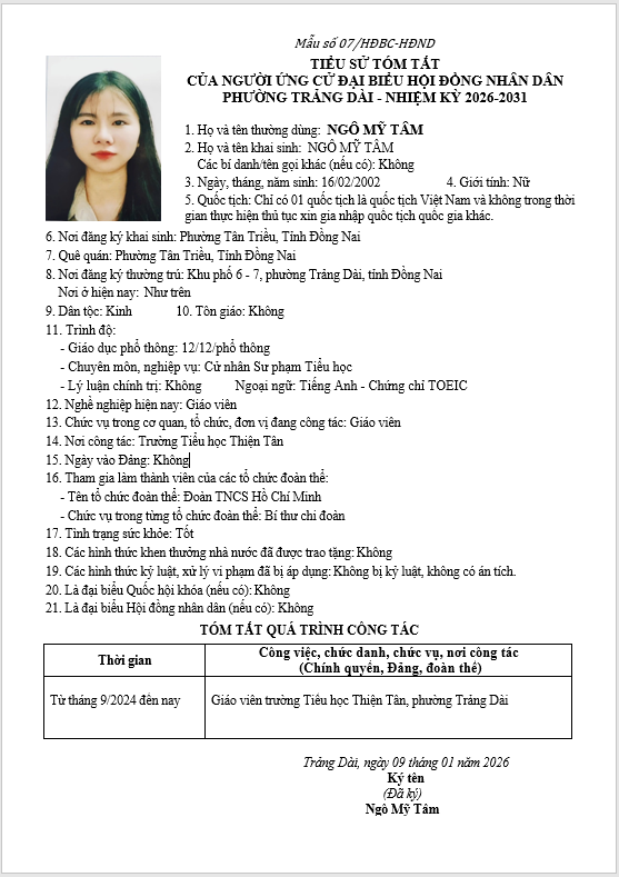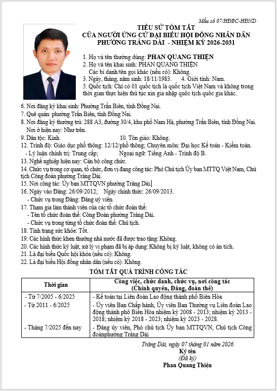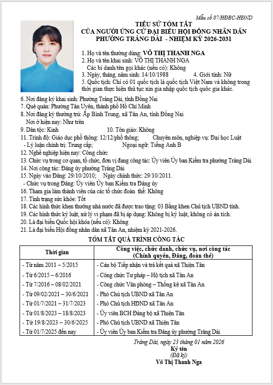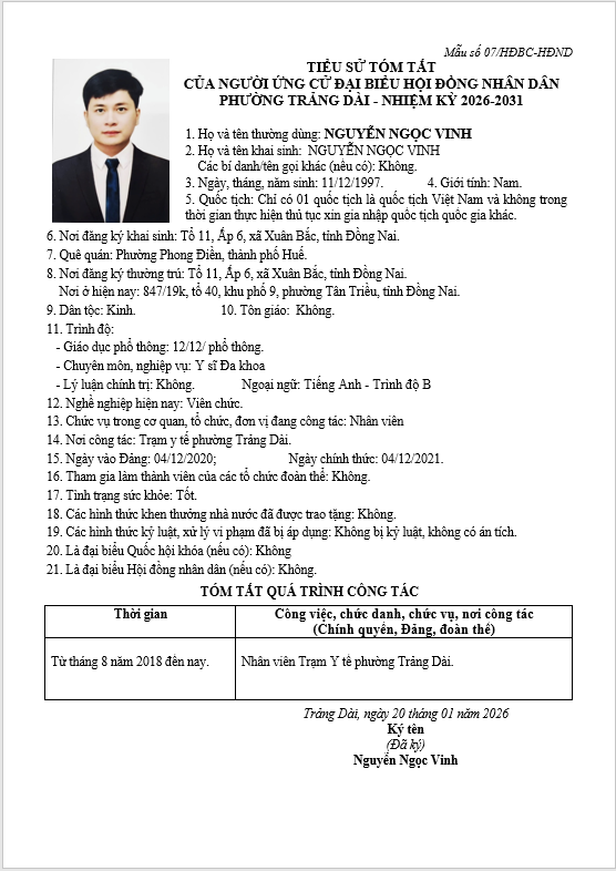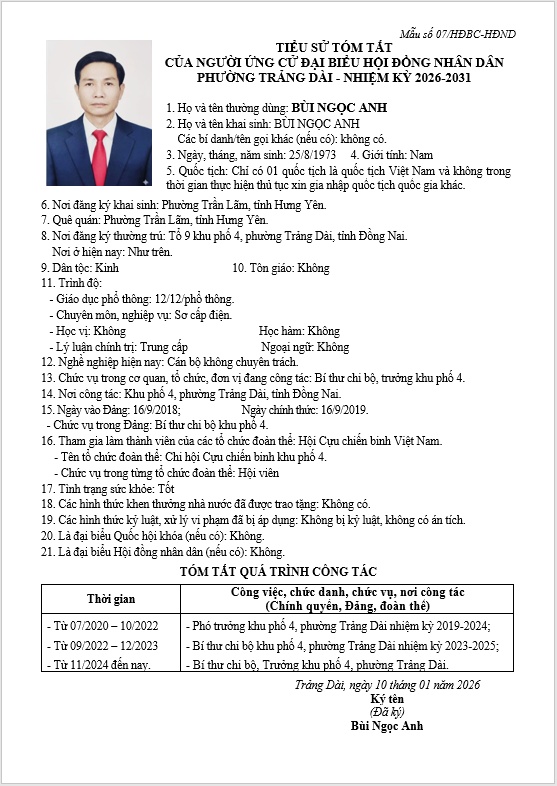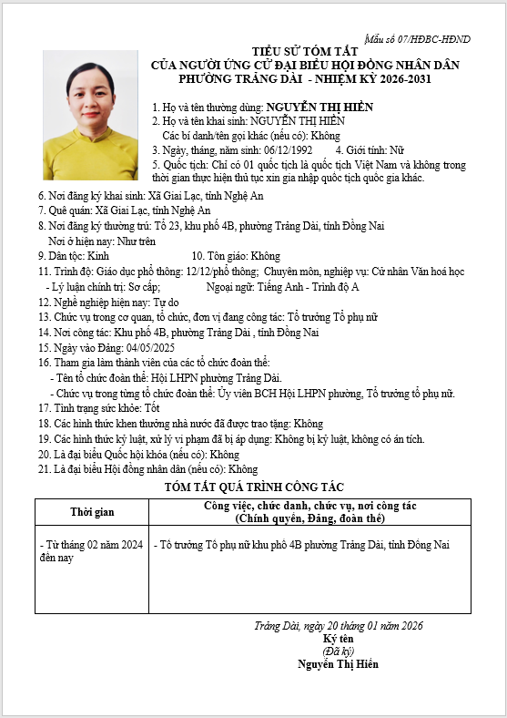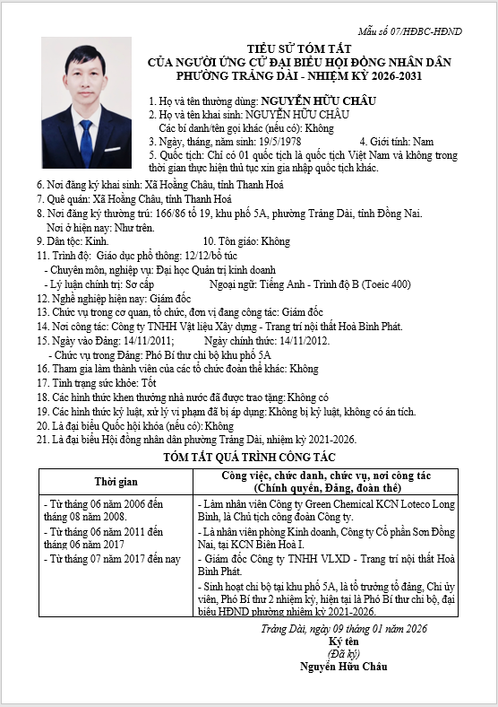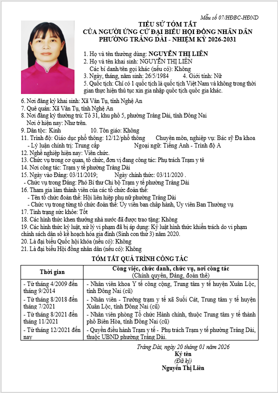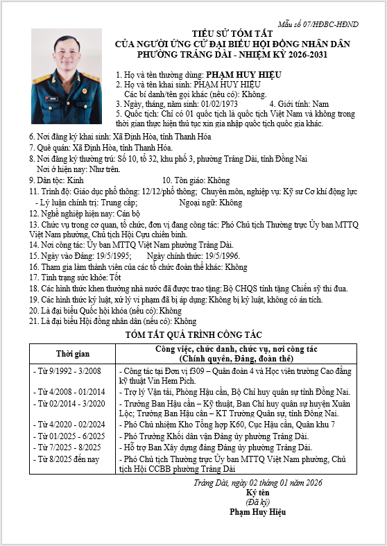 TIỂU SỬ TÓM TẮT CỦA NGƯỜI ỨNG CỬ ĐẠI BIỂU HỘI ĐỒNG NHÂN DÂN PHƯỜNG TRẢNG DÀI - NHIỆM KỲ 2026-2031