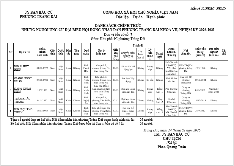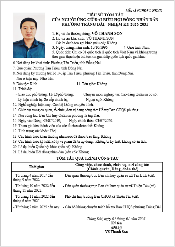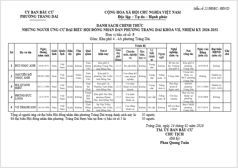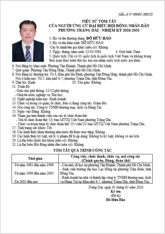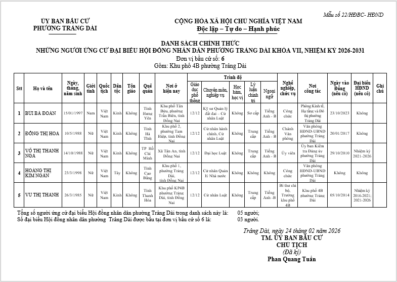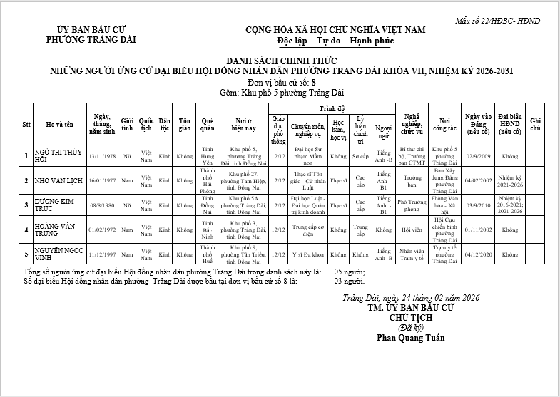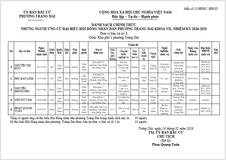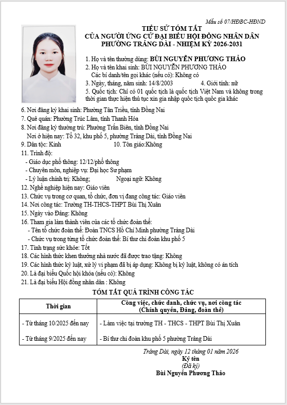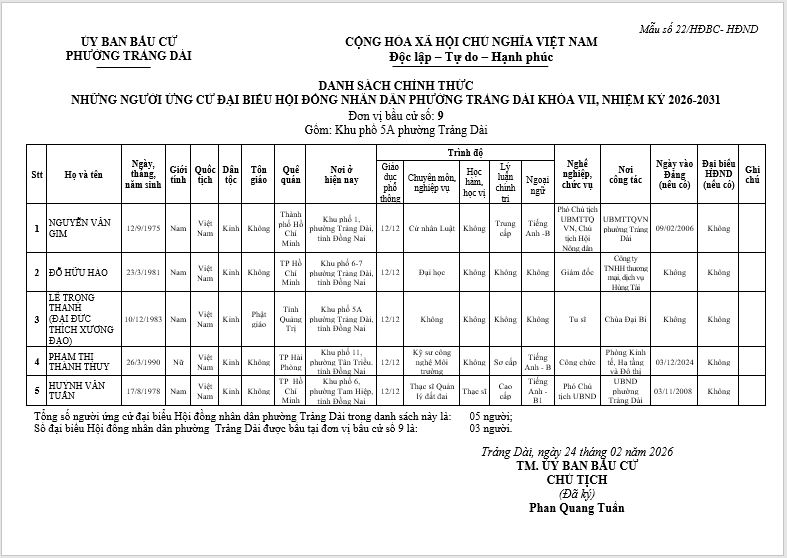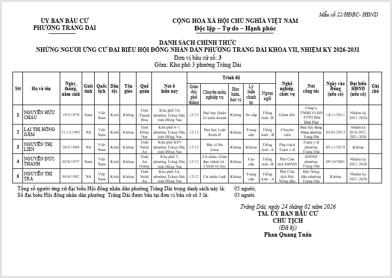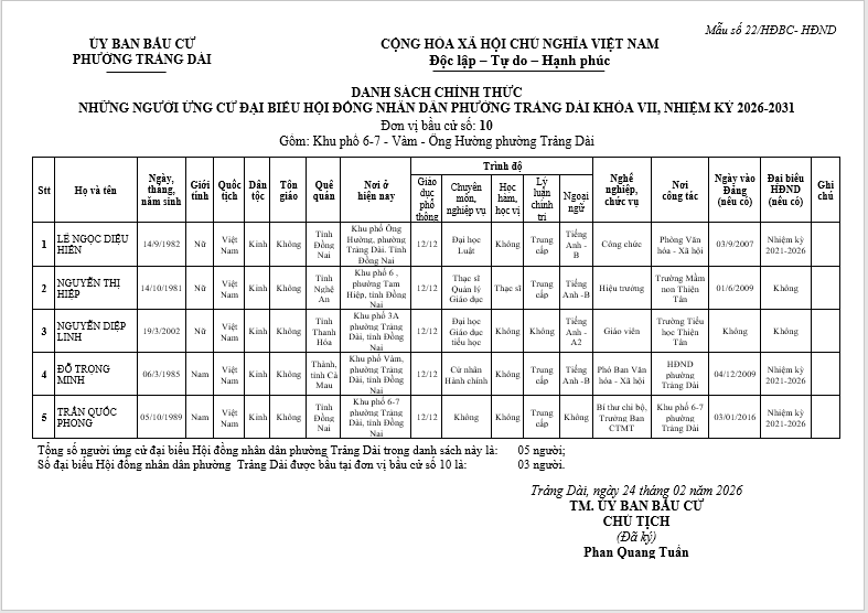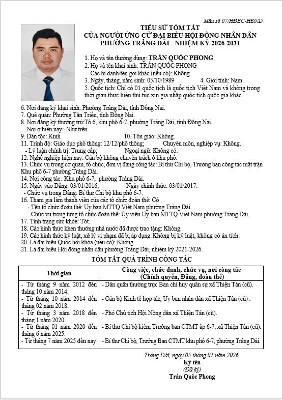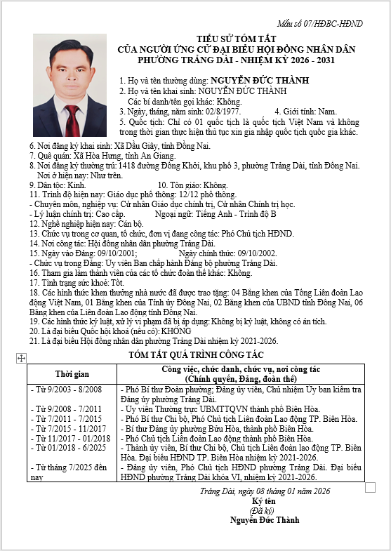 TIỂU SỬ TÓM TẮT CỦA NGƯỜI ỨNG CỬ ĐẠI BIỂU HỘI ĐỒNG NHÂN DÂN PHƯỜNG TRẢNG DÀI - NHIỆM KỲ 2026-2031