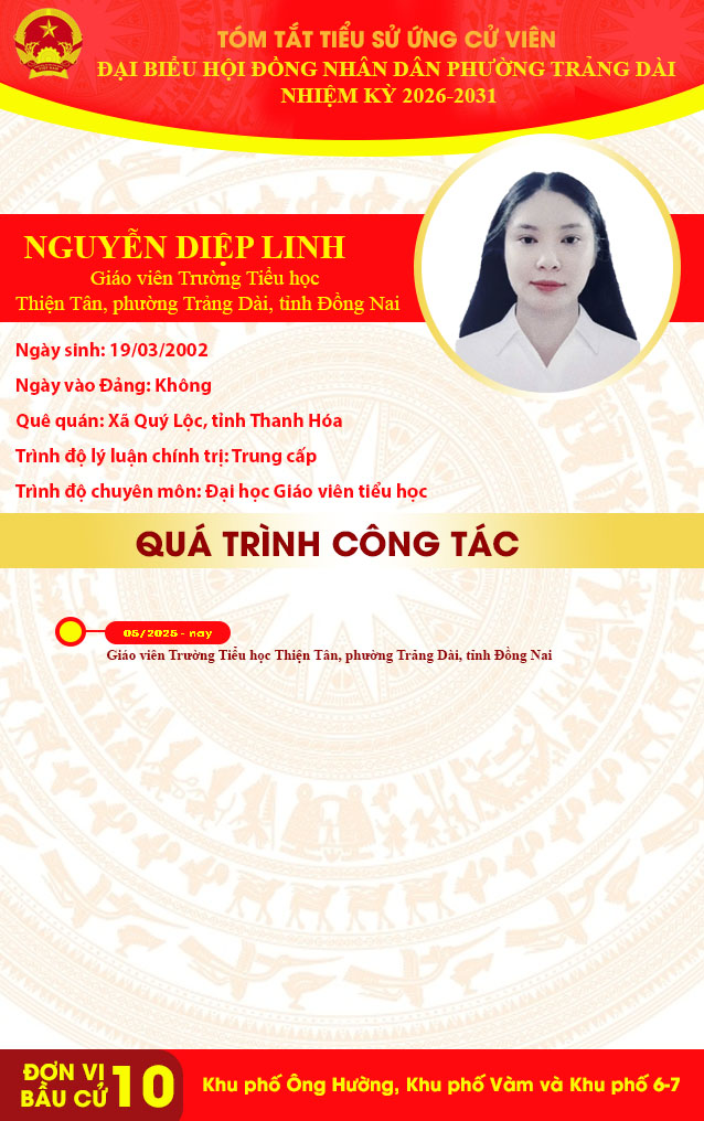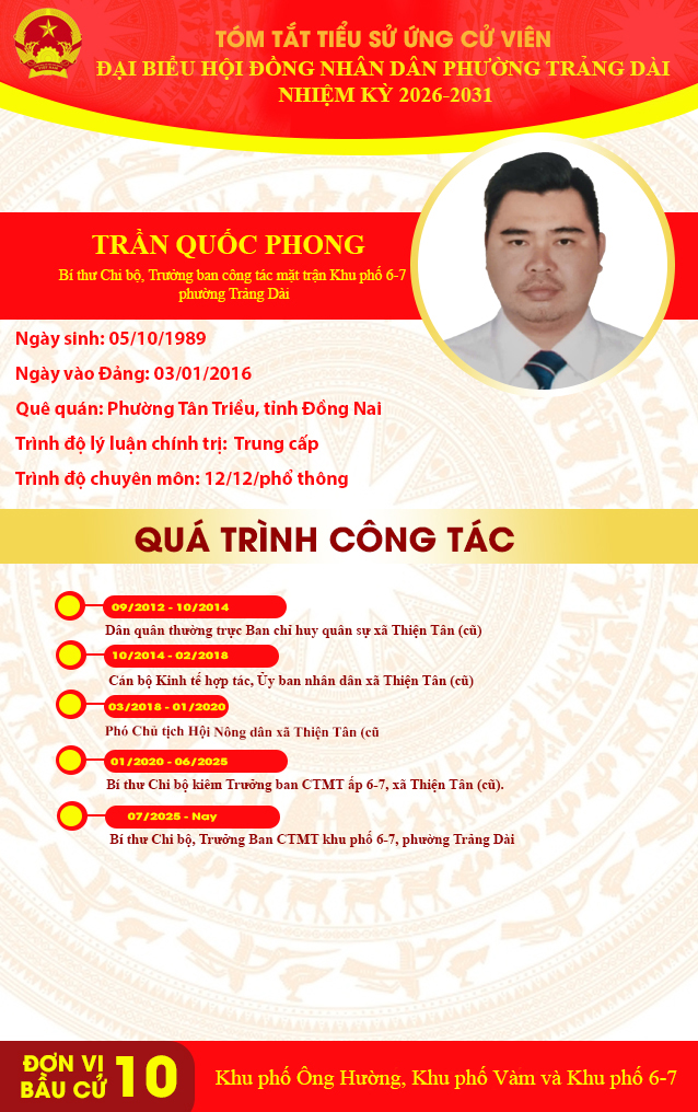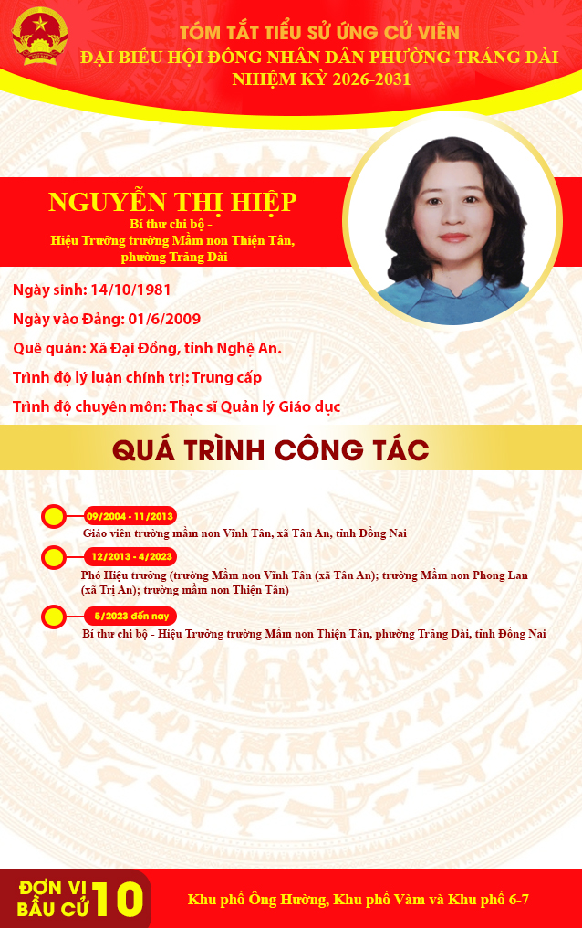 TÓM TẮT TIỂU SỬ ỨNG CỬ VIÊN ĐẠI BIỂU HỘI ĐỒNG NHÂN DÂN PHƯỜNG TRẢNG DÀI NHIỆM KỲ 2026-2031 ĐƠN VỊ BẦU CỬ SỐ 10