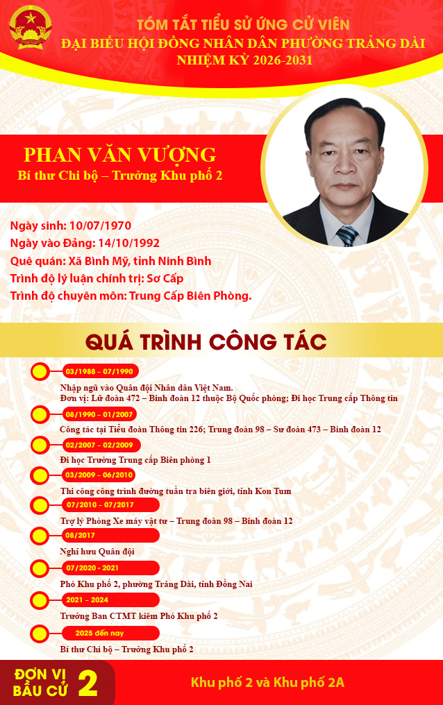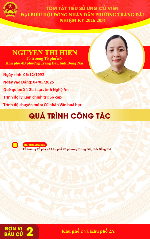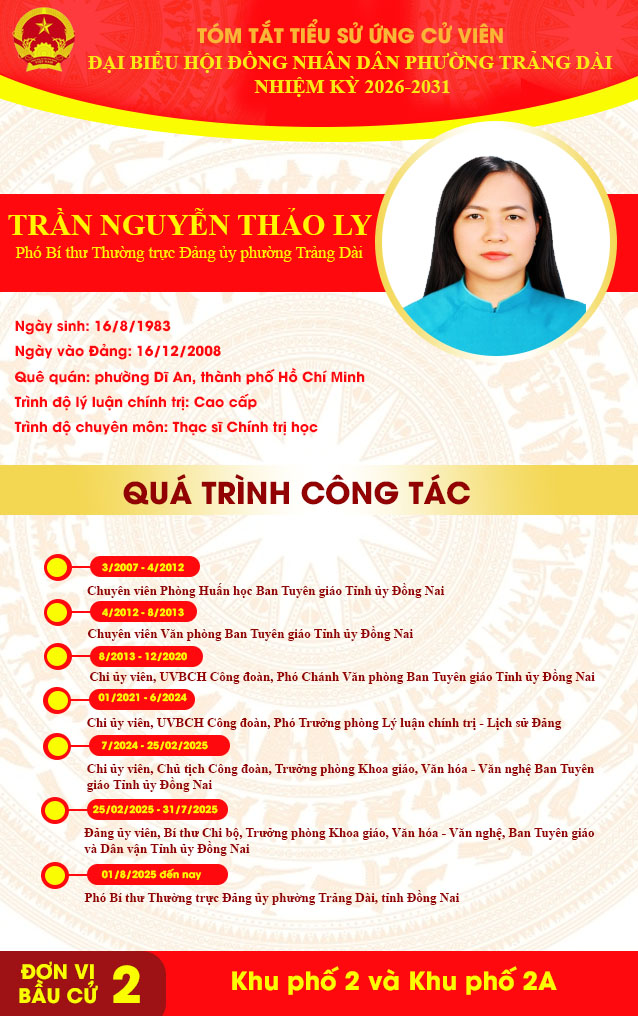 TÓM TẮT TIỂU SỬ ỨNG CỬ VIÊN ĐẠI BIỂU HỘI ĐỒNG NHÂN DÂN PHƯỜNG TRẢNG DÀI NHIỆM KỲ 2026-2031 ĐƠN VỊ BẦU CỬ SỐ 2