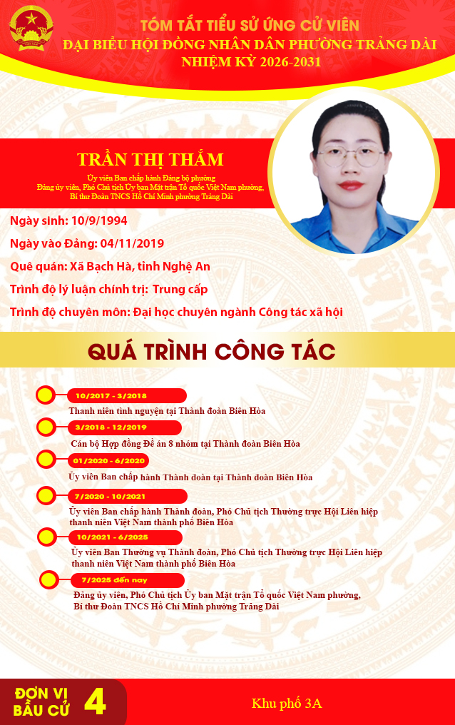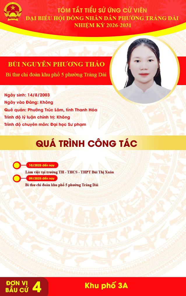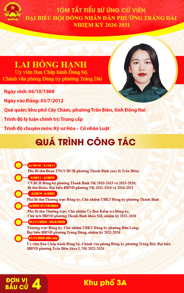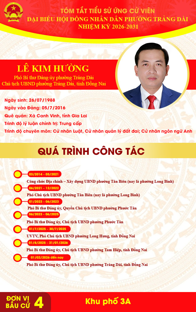 TÓM TẮT TIỂU SỬ ỨNG CỬ VIÊN ĐẠI BIỂU HỘI ĐỒNG NHÂN DÂN PHƯỜNG TRẢNG DÀI NHIỆM KỲ 2026-2031. ĐƠN VỊ BẦU CỬ SỐ 4