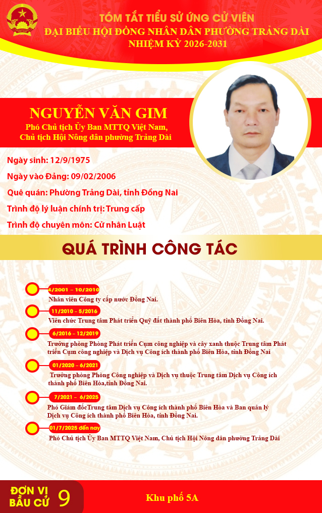 TÓM TẮT TIỂU SỬ ỨNG CỬ VIÊN ĐẠI BIỂU HỘI ĐỒNG NHÂN DÂN PHƯỜNG TRẢNG DÀI NHIỆM KỲ 2026-2031 ĐƠN VỊ BẦU CỬ SỐ 9