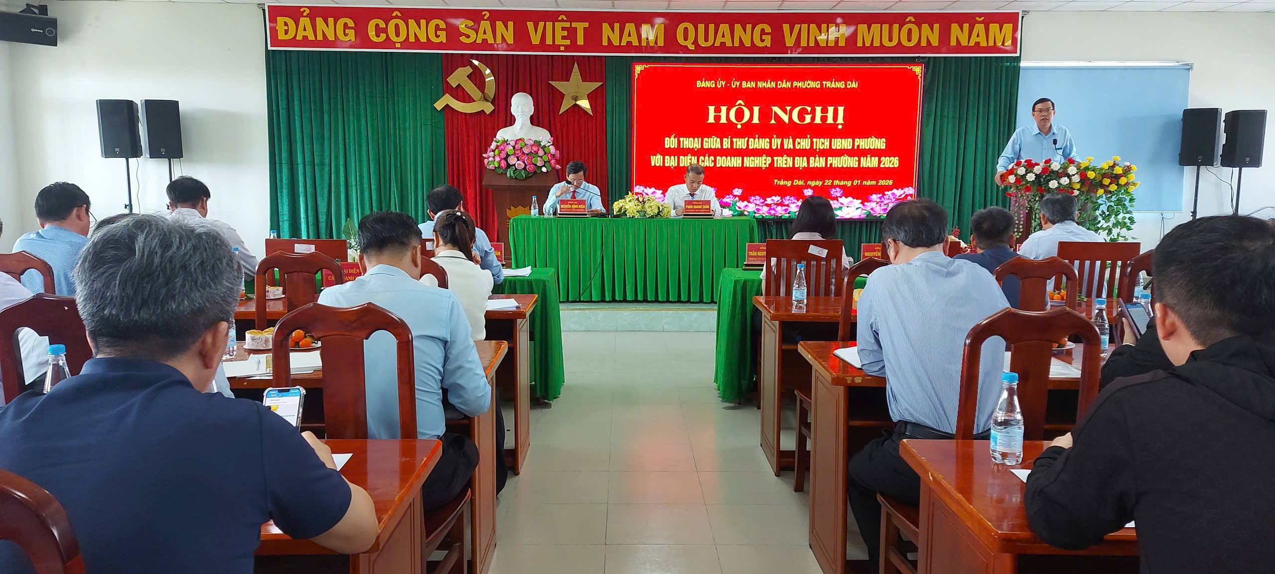 Ngày 22-1, phường Trảng Dài tổ chức Hội nghị đối thoại giữa Bí thư Đảng ủy, Chủ tịch UBND phường với gần 100 doanh nghiệp trên địa bàn năm 2026. Hội nghị do đồng chí Phan Quang Tuấn, Bí thư Đảng ủy phường và đồng chí Nguyễn Đình Kiên, Chủ tịch UBND phường Trảng Dài chủ trì. Tham dự hội nghị có đại diện, lãnh đạo các sở, ngành của tỉnh Đồng Nai gồm: Sở Nội vụ, Sở Tài chính, Thuế cơ sở 3, Bảo hiểm xã hội cơ sở Trị An, Phòng Cảnh sát phòng cháy, chữa cháy và cứu nạn, cứu hộ Công an tỉnh Đồng Nai.