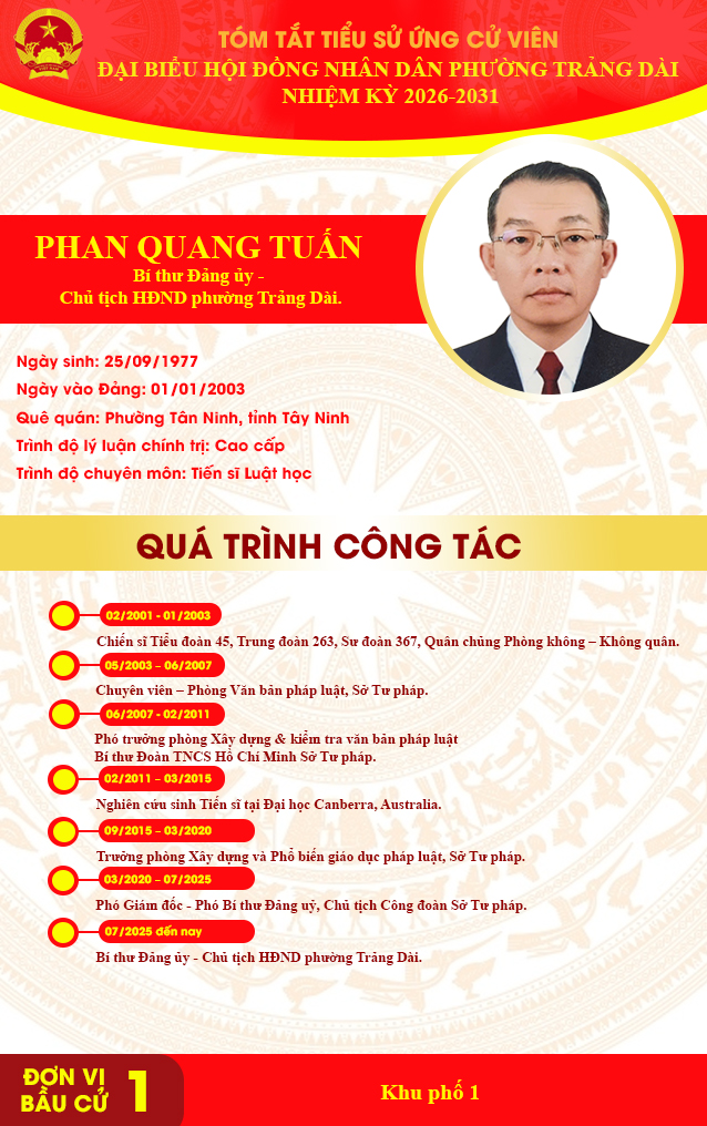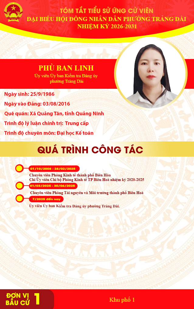 <p style="text-align:center;"><strong>TÓM TẮT TIỂU SỬ ỨNG CỬ VIÊN ĐẠI BIỂU HỘI ĐỒNG NHÂN DÂN PHƯỜNG TRẢNG DÀI NHIỆM KỲ 2026-2031</strong></p><p style="text-align:center;"><strong>&nbsp;ĐƠN VỊ BẦU CỬ SỐ 1</strong></p><figure class="image"><img style="aspect-ratio:638/1016;" src="https://trangdai.dongnai.gov.vn/uploads/trangdai/news/2026_03/nguyen-thi-huu.jpg" width="638" height="1016" /></figure><figure class="image"><img style="aspect-ratio:638/1016;" src="https://trangdai.dongnai.gov.vn/uploads/trangdai/news/2026_03/phu-ban-linh.jpg" width="638" height="1016" /></figure><figure class="image"><img /></figure><figure class="image"><img style="aspect-ratio:638/1016;" src="https://trangdai.dongnai.gov.vn/uploads/trangdai/news/2026_03/ngo-my-tam.jpg" width="638" height="1016" /></figure><figure class="image"><img style="aspect-ratio:638/1016;" src="https://trangdai.dongnai.gov.vn/uploads/trangdai/news/2026_03/phan-quang-tuan.jpg" width="638" height="1016" /></figure>