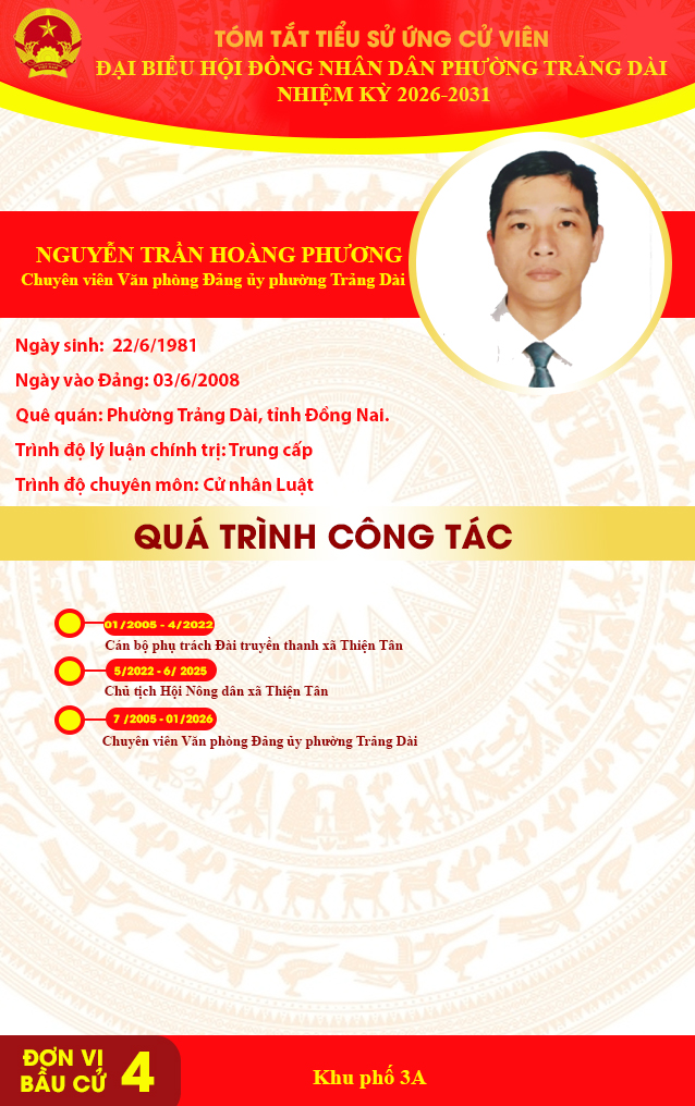 <p style="text-align:center;"><strong>TÓM TẮT TIỂU SỬ ỨNG CỬ VIÊN ĐẠI BIỂU HỘI ĐỒNG NHÂN DÂN PHƯỜNG TRẢNG DÀI NHIỆM KỲ 2026-2031</strong></p><p style="text-align:center;"><strong>&nbsp;ĐƠN VỊ BẦU CỬ SỐ 4</strong></p><figure class="image"><img style="aspect-ratio:638/1016;" src="https://trangdai.dongnai.gov.vn/uploads/trangdai/news/2026_03/lai-hong-hanh.jpg" width="638" height="1016" /></figure><figure class="image"><img style="aspect-ratio:638/1016;" src="https://trangdai.dongnai.gov.vn/uploads/trangdai/news/2026_03/le-kim-huong.jpg" width="638" height="1016" /></figure><figure class="image"><img style="aspect-ratio:638/1016;" src="https://trangdai.dongnai.gov.vn/uploads/trangdai/news/2026_03/nguyen-tran-hoang-phuong.jpg" width="638" height="1016" /></figure><figure class="image"><img style="aspect-ratio:638/1016;" src="https://trangdai.dongnai.gov.vn/uploads/trangdai/news/2026_03/bui-nguyen-phuong-thao.jpg" width="638" height="1016" /></figure><figure class="image"><img style="aspect-ratio:638/1016;" src="https://trangdai.dongnai.gov.vn/uploads/trangdai/news/2026_03/tran-thi-tham.jpg" width="638" height="1016" /></figure>