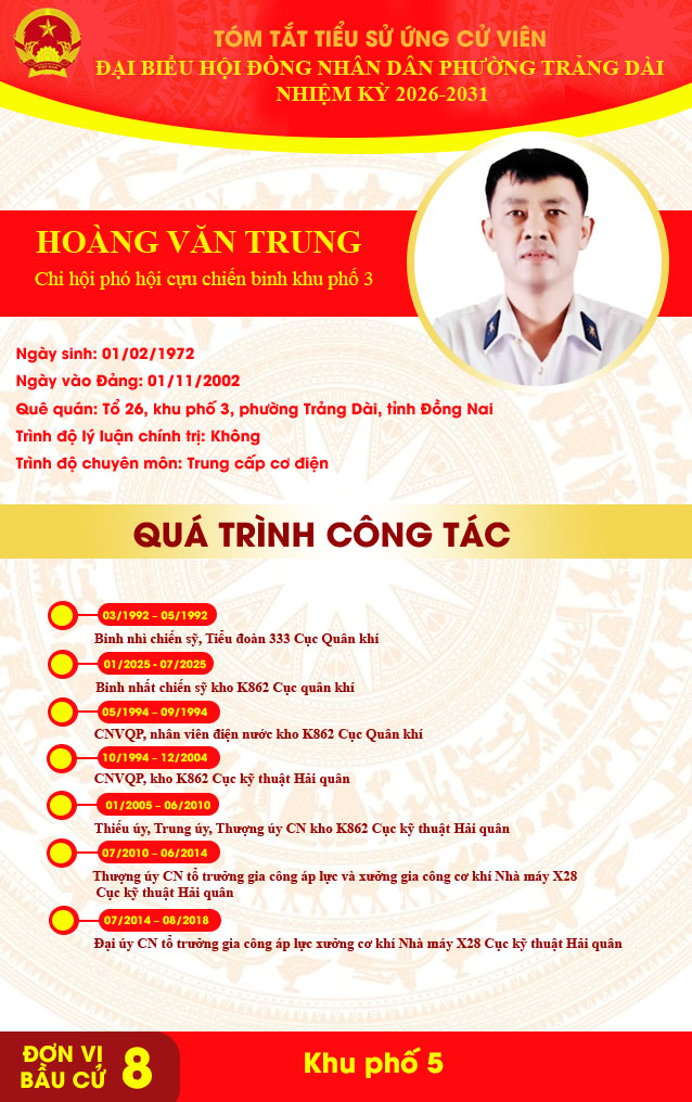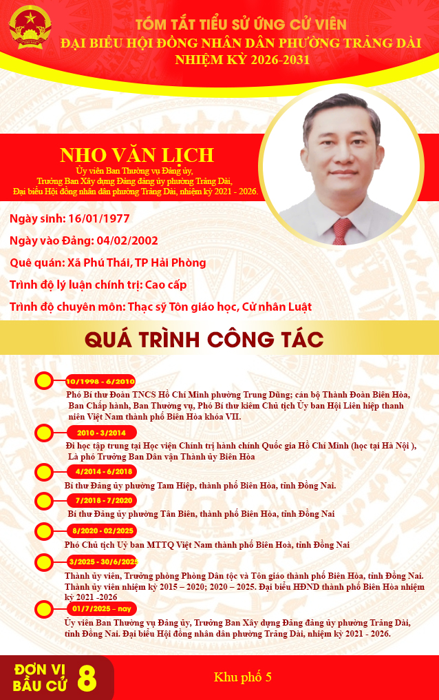 <p style="text-align:center;"><strong>TÓM TẮT TIỂU SỬ ỨNG CỬ VIÊN ĐẠI BIỂU HỘI ĐỒNG NHÂN DÂN PHƯỜNG TRẢNG DÀI NHIỆM KỲ 2026-2031&nbsp;</strong></p><p style="text-align:center;"><strong>ĐƠN VỊ BẦU CỬ SỐ 8</strong></p><figure class="image"><img style="aspect-ratio:638/1016;" src="https://trangdai.dongnai.gov.vn/uploads/trangdai/news/2026_03/ngo-thi-thuy-hoi.jpg" width="638" height="1016" /></figure><figure class="image"><img style="aspect-ratio:638/1016;" src="https://trangdai.dongnai.gov.vn/uploads/trangdai/news/2026_03/nho-van-lich.jpg" width="638" height="1016" /></figure><figure class="image"><img style="aspect-ratio:638/1016;" src="https://trangdai.dongnai.gov.vn/uploads/trangdai/news/2026_03/duong-kim-truc.jpg" width="638" height="1016" /></figure><figure class="image"><img style="aspect-ratio:638/1016;" src="https://trangdai.dongnai.gov.vn/uploads/trangdai/news/2026_03/hoang-van-trung.jpg" width="638" height="1016" /></figure><figure class="image"><img style="aspect-ratio:638/1016;" src="https://trangdai.dongnai.gov.vn/uploads/trangdai/news/2026_03/nguyen-ngoc-vinh.jpg" width="638" height="1016" /></figure>