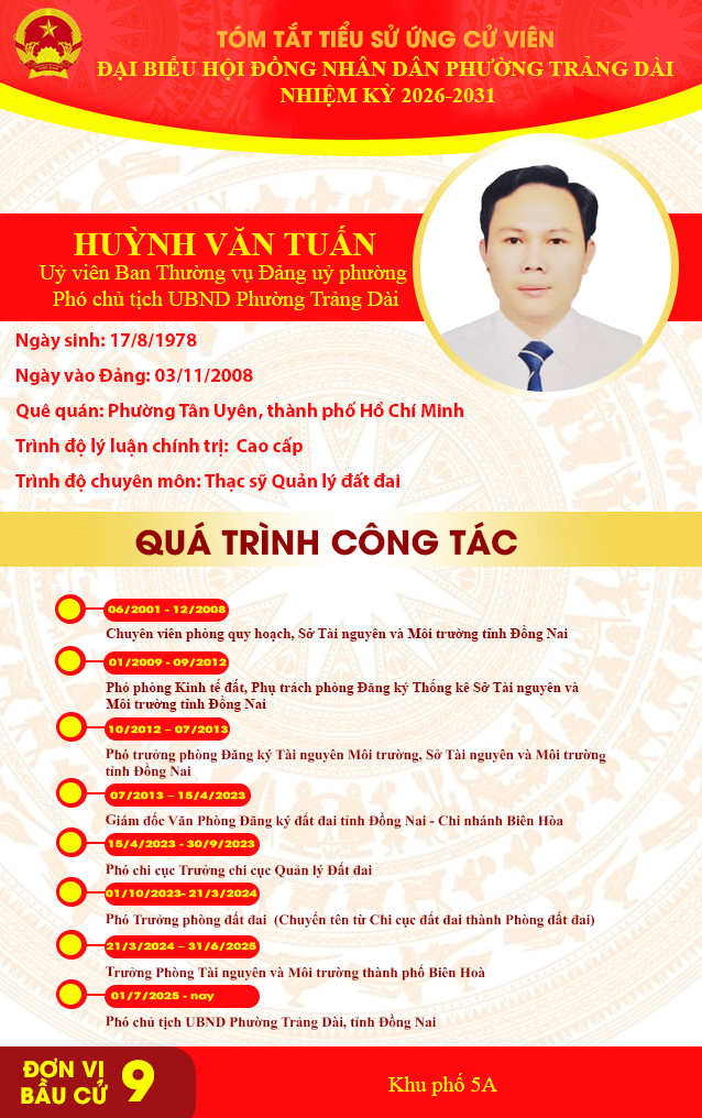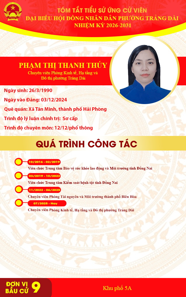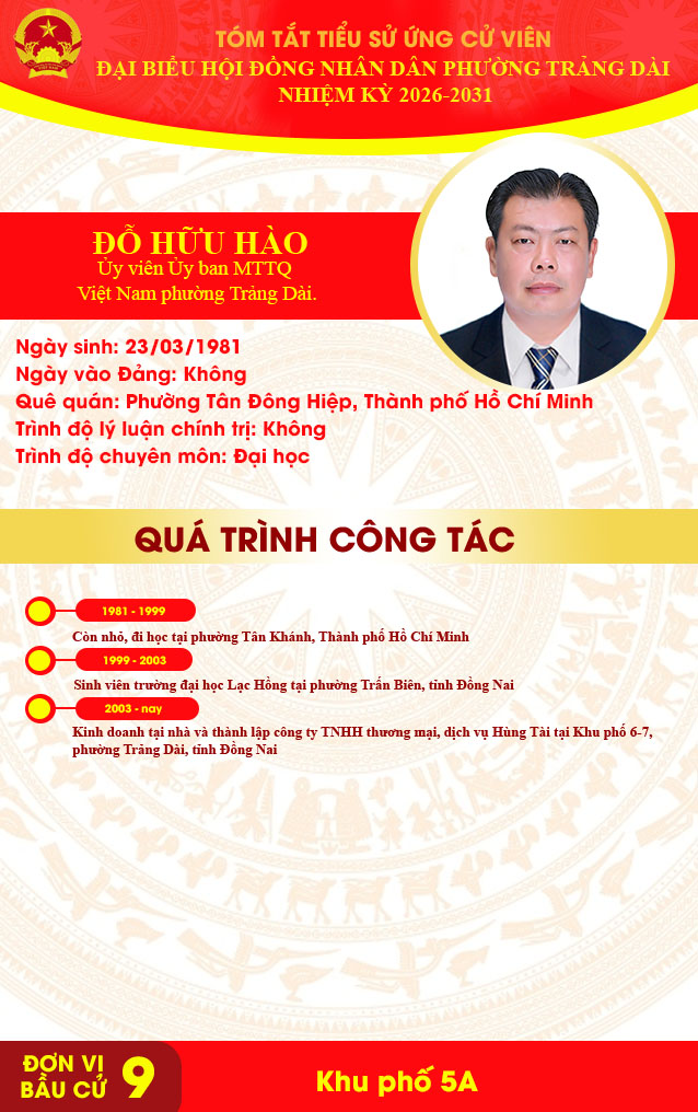 <p style="text-align:center;"><strong>TÓM TẮT TIỂU SỬ ỨNG CỬ VIÊN ĐẠI BIỂU HỘI ĐỒNG NHÂN DÂN PHƯỜNG TRẢNG DÀI NHIỆM KỲ 2026-2031&nbsp;</strong></p><p style="text-align:center;"><strong>ĐƠN VỊ BẦU CỬ SỐ 9</strong></p><figure class="image"><img style="aspect-ratio:638/1016;" src="https://trangdai.dongnai.gov.vn/uploads/trangdai/news/2026_03/nguyen-van-gim.jpg" width="638" height="1016" /></figure><figure class="image"><img style="aspect-ratio:638/1016;" src="https://trangdai.dongnai.gov.vn/uploads/trangdai/news/2026_03/do-huu-hao.jpg" width="638" height="1016" /></figure><figure class="image"><img style="aspect-ratio:638/1016;" src="https://trangdai.dongnai.gov.vn/uploads/trangdai/news/2026_03/le-trong-thanh.jpg" width="638" height="1016" /></figure><figure class="image"><img style="aspect-ratio:638/1016;" src="https://trangdai.dongnai.gov.vn/uploads/trangdai/news/2026_03/pham-thi-thanh-thuy.jpg" width="638" height="1016" /></figure><figure class="image"><img style="aspect-ratio:638/1016;" src="https://trangdai.dongnai.gov.vn/uploads/trangdai/news/2026_03/huynh-van-tuan.jpg" width="638" height="1016" /></figure>