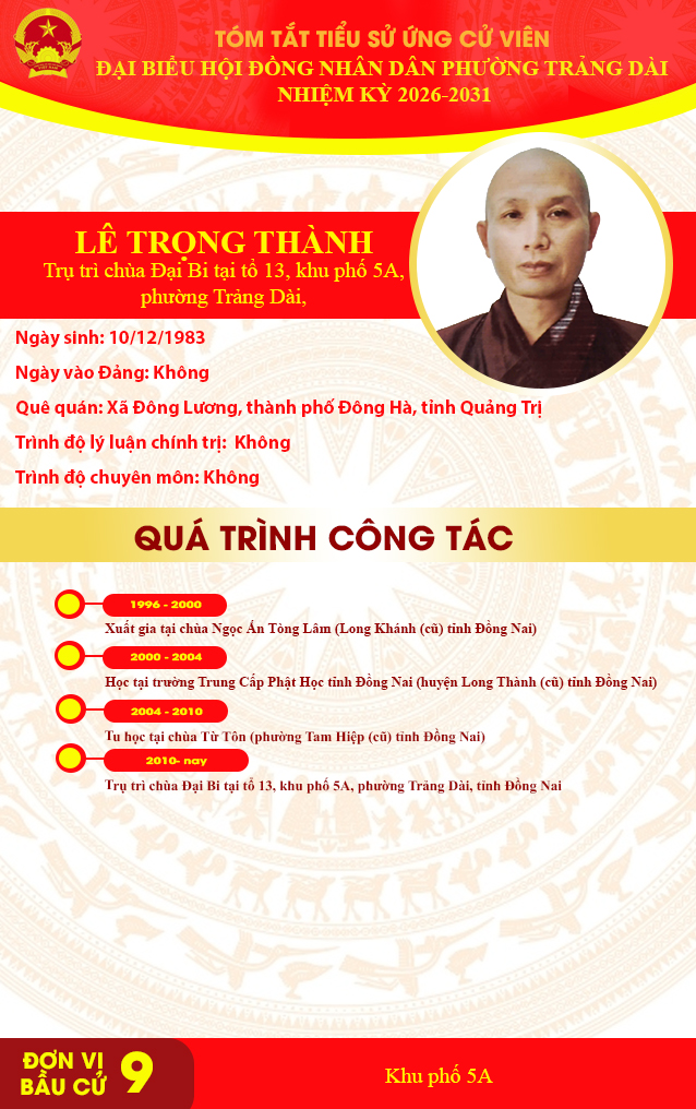 <h1>TÓM TẮT TIỂU SỬ ỨNG CỬ VIÊN ĐẠI BIỂU HỘI ĐỒNG NHÂN DÂN PHƯỜNG TRẢNG DÀI NHIỆM KỲ 2026-2031 ĐƠN VỊ BẦU CỬ SỐ 9</h1>