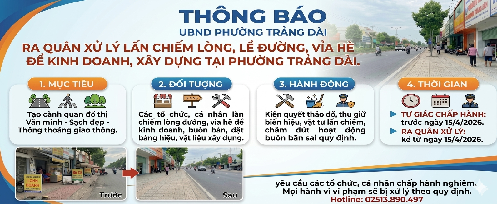 <p style="margin-left:7.1pt;text-align:justify;">Để nâng cao ý thức chấp hành pháp luật của người dân hoạt động kinh doanh, buôn bán dọc các tuyến đường trên địa bàn phường, đảm bảo giữ gìn trật tự an toàn giao thông, trật tự và mỹ quan đô thị; UBND phường Trảng Dài thông báo đến các tổ chức, cá nhân hoạt động kinh doanh, buôn bán dọc theo các tuyến đường trên địa bàn phường Trảng Dài.</p><p style="margin-left:7.1pt;text-align:justify;">- Nghiêm cấm đối với hành vi lấn chiếm lòng, lề đường, vỉa hè để hoạt động buôn bán, kinh doanh, xây dựng công trình, đặt bảng hiệu,….. dưới mọi hình thức.</p><p style="margin-left:7.1pt;text-align:justify;">- Các trường hợp vi phạm phải tự giác tháo dỡ, di dời hoạt động kinh doanh, buôn bán, các vật dụng, hàng hóa, công trình,... ra khỏi phạm vi lấn chiếm <strong>trước ngày 15/4/2026.</strong></p><p style="margin-left:7.1pt;text-align:justify;"><strong>Kể từ ngày 15/4/2026</strong>, UBND phường Trảng Dài sẽ xử lý theo quy định đối với những trường hợp cố tình vi phạm, không chấp hành di dời, tháo dỡ các vật dụng, công trình ra khỏi vị trí đã lấn chiếm.</p><figure class="image"><img style="aspect-ratio:1591/656;" src="https://trangdai.dongnai.gov.vn/uploads/trangdai/news/2026_04/gemini_generated_image_ikhtffikhtffikht.png" width="1591" height="656" /></figure>