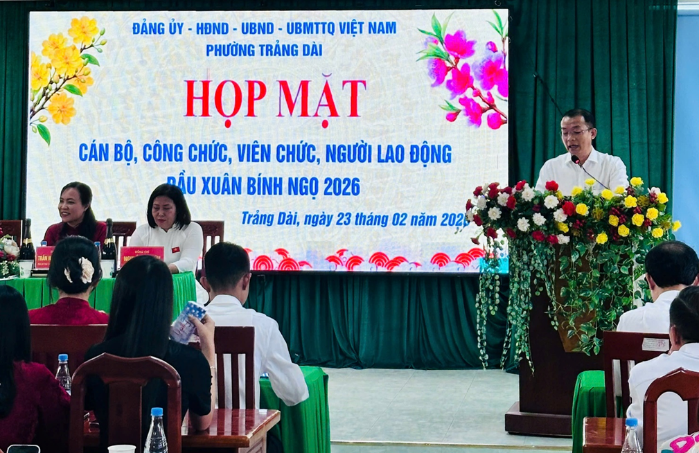 Nhằm tạo không khí vui tươi, phấn khởi cho những ngày đầu năm, gặp gỡ, chia sẻ niềm vui năm mới, tạo khí thế thi đua sôi nổi hoàn thành thắng lợi các nhiệm vụ chính trị trong năm 2026. Sáng ngày 23/2/2026 tại trụ sở UBND phường Trảng Dài. Đại diện lãnh đạo Đảng ủy - HĐND - UBND - UBMTTQ Việt Nam phường Trảng Dài tổ chức họp mặt đầu năm cho toàn thể cán bộ, công chức, viên chức, người hoạt động không chuyên trách, người lao động trong các cơ quan giúp việc của Đảng ủy, UBMTTQ Việt Nam phường và các phòng chuyên môn, Trung tâm Phục vụ Hành chính công, Trung tâm Dịch vụ tổng hợp thuộc UBND phường; Ban Chỉ huy Quân sự phường mừng Đảng quang vinh, mừng Xuân Bính Ngọ năm 2026.